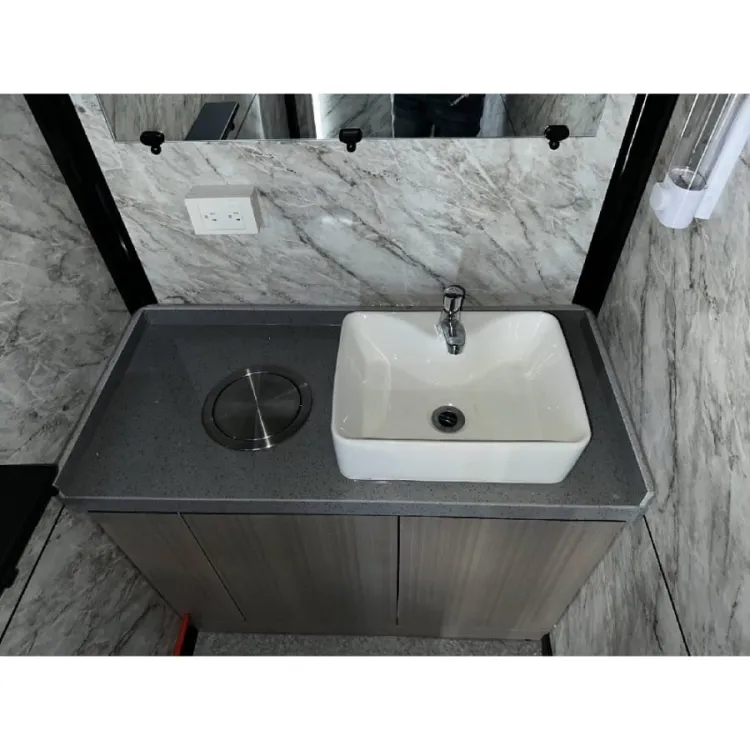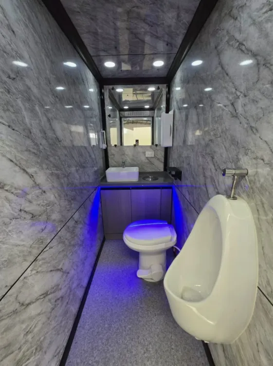 Inside, you'll find two private stalls with toilets and one private stall with a toilet and urinal, all wrapped in elegant finishes and climate-controlled comfort. With stylish vanities, faux-marble walls, and built-in LED mood lighting, this isn’t just a restroom—it’s a VIP experience.