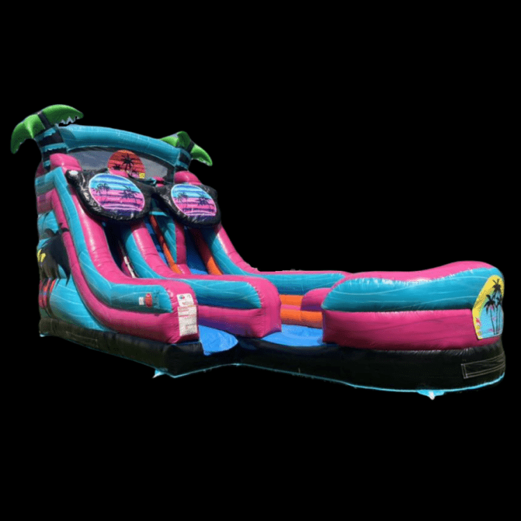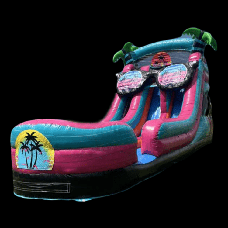 Turn any event into a beach-themed celebration with our 18' Dual Lane Beach Vibes Water Slide. With bright tropical colors, palm trees, and oversized sunglasses, this slide brings instant summer fun to parties, schools, churches, and community events. Two racing lanes let riders compete side-by-side, and the large inflated splash pool delivers a safe, refreshing landing for kids, teens, and adventurous adults.