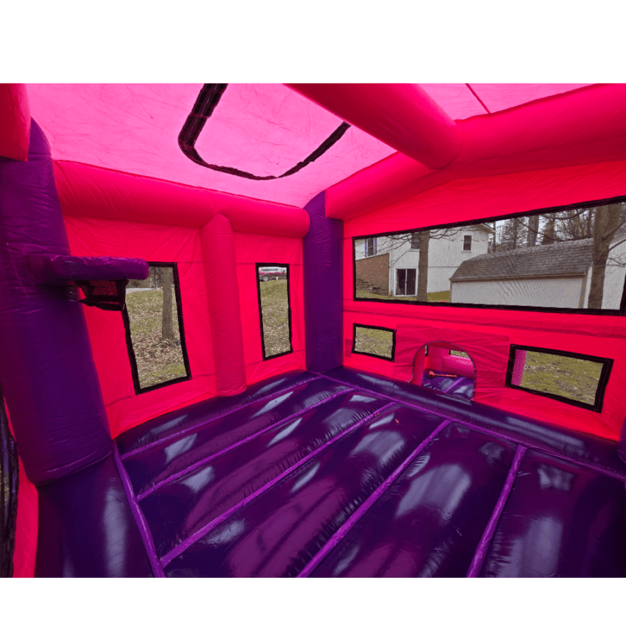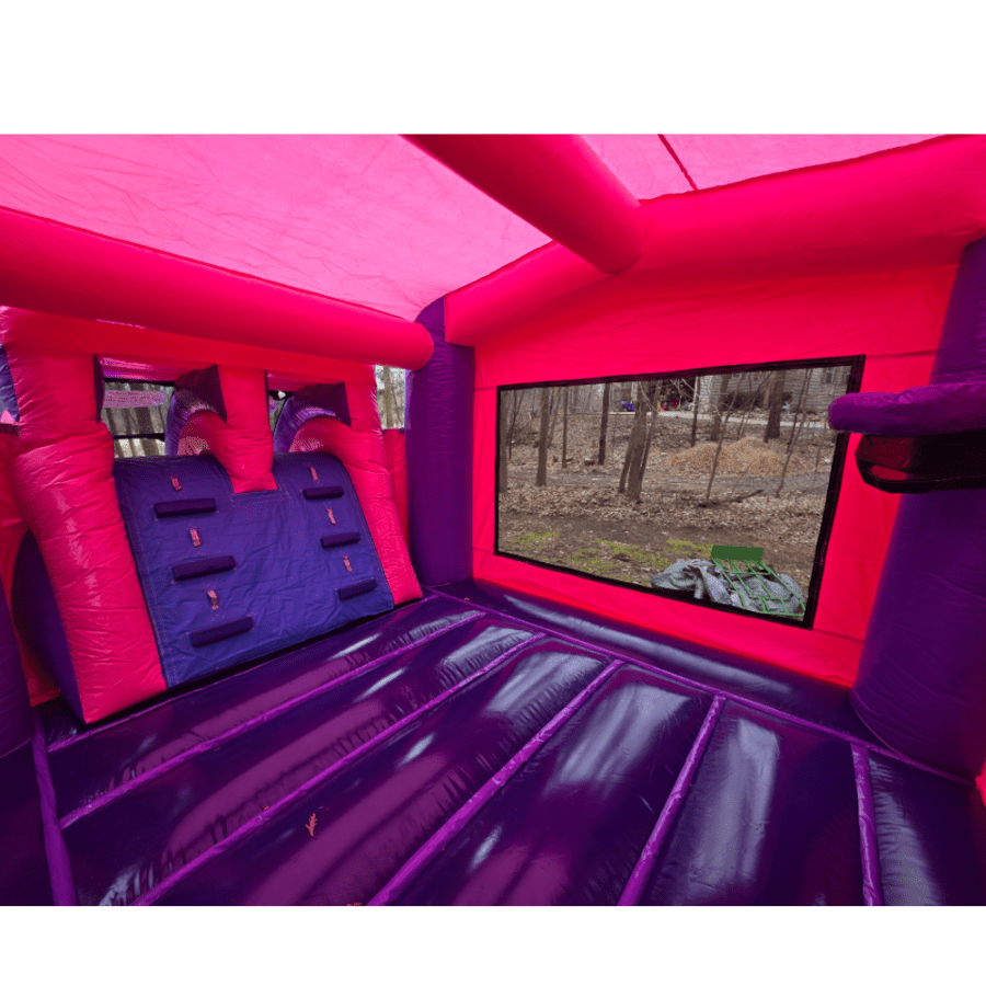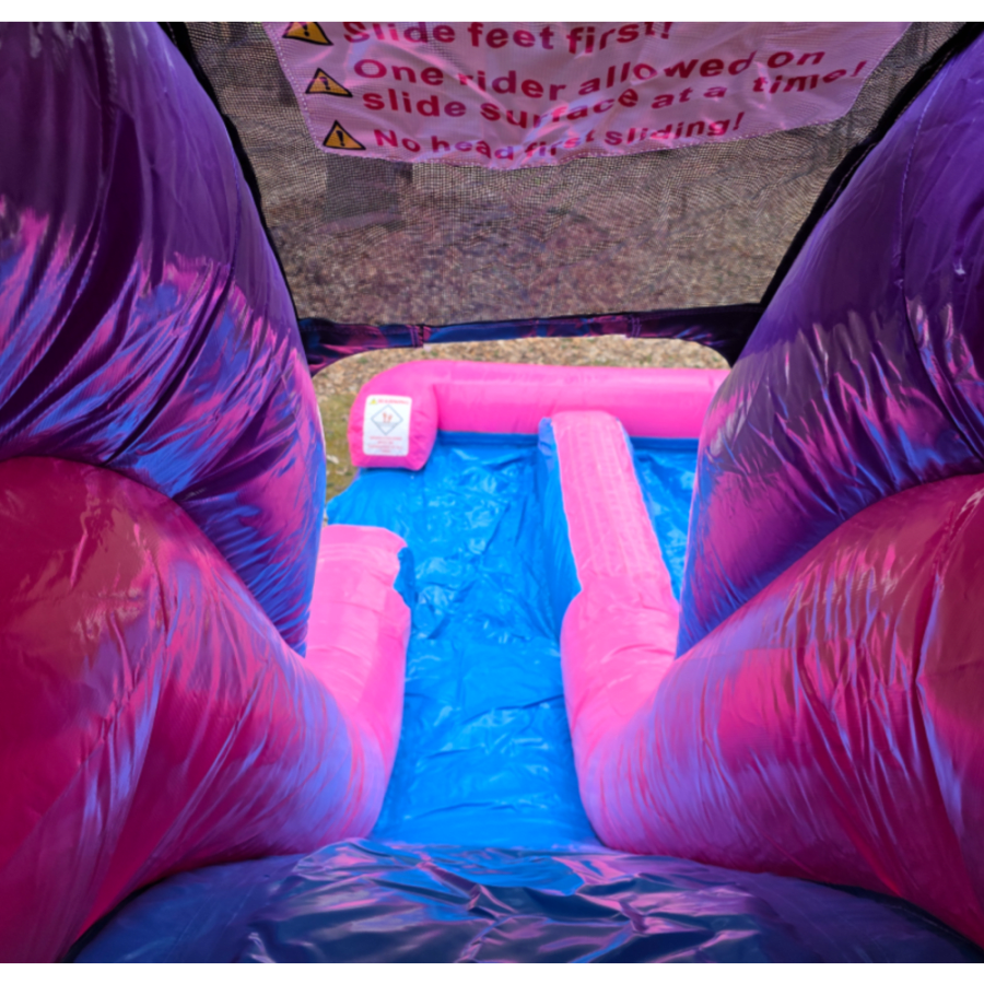 Treat your little princess to a magical experience with the Princess Splash Combo! This stunning pink and purple inflatable is designed for non-stop fun, featuring a spacious bounce area, an exciting dual-lane slide, and even a basketball hoop for added entertainment. Whether used wet or dry, this unit is the perfect addition to any princess-themed party, birthday celebration, or special event.